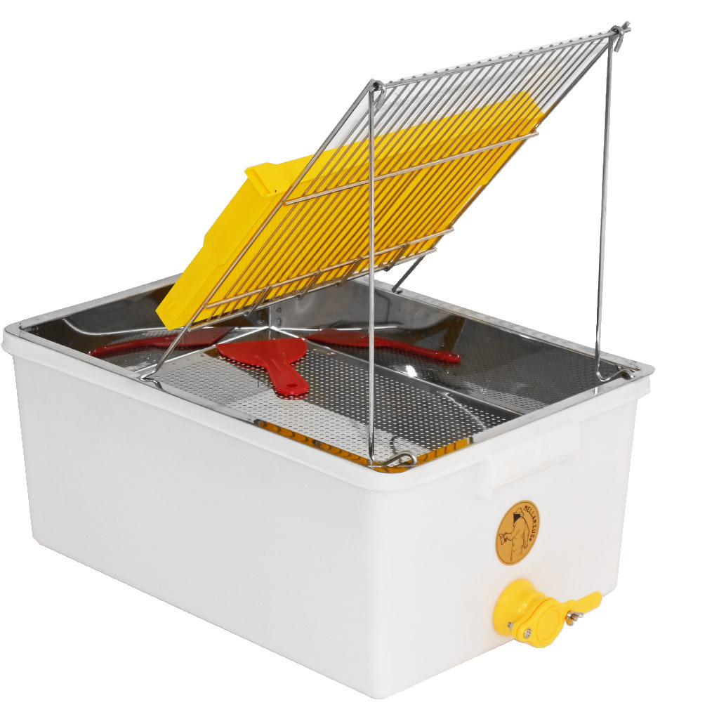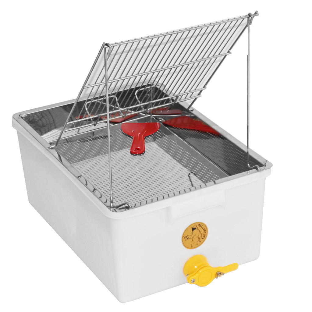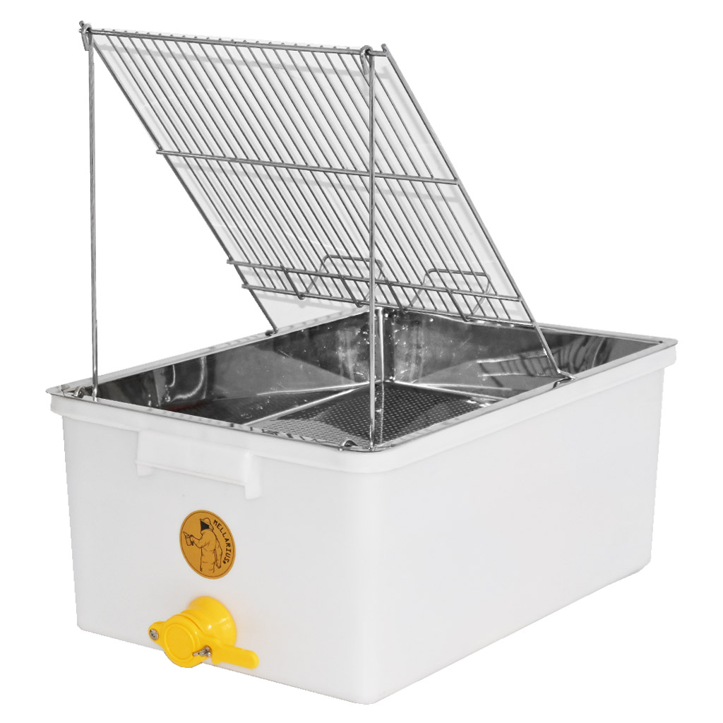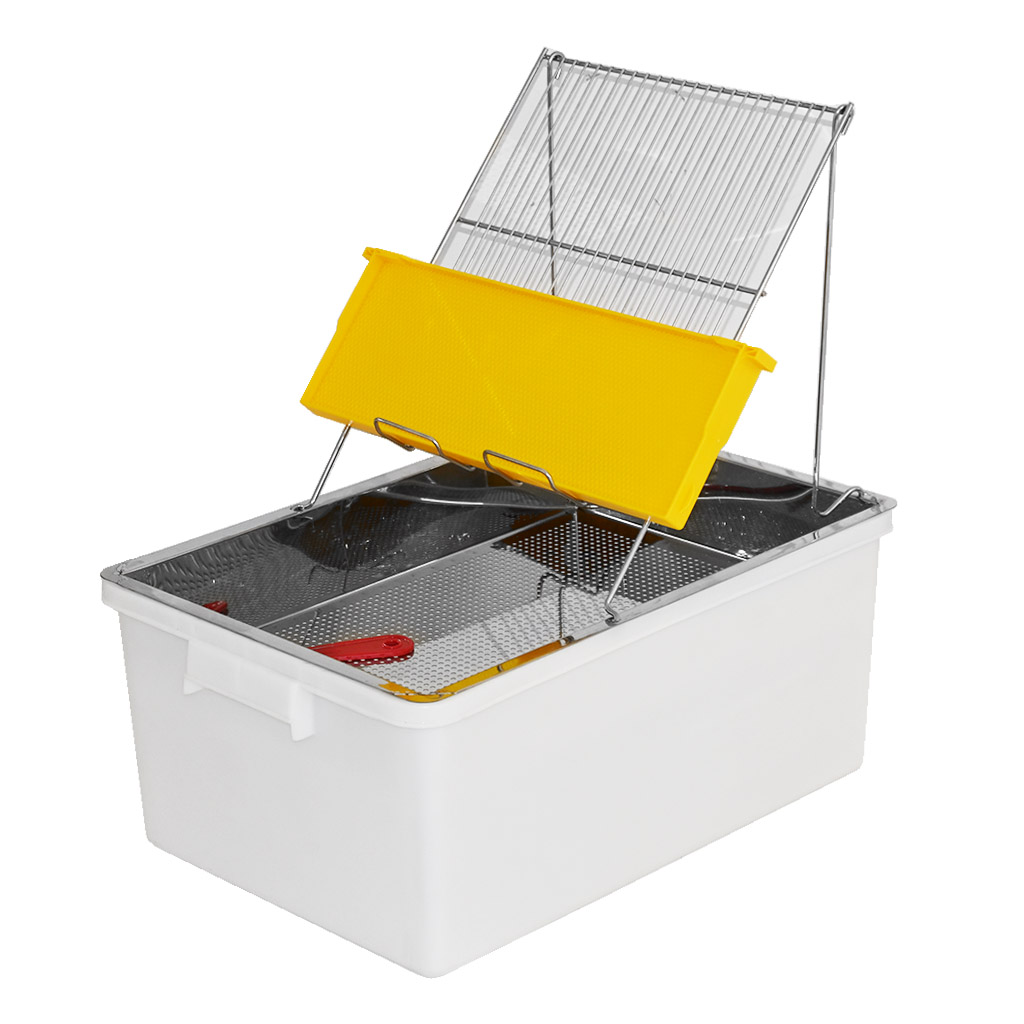 Odvíčkovací souprava s perforovanou nerezovou vanou a plastovou spodní nádobou. Nerezové síto slouží k separaci zavíčkovacího vosku od stékajícího medu. Opora pro rámky umožňuje stabilní usazení plástve při odvíčkování odvíčkovací vidličkou nebo nožem. Hloubka vaničky 27 cm zajišťuje dostatečný objem pro zachycení medu i víček bez nutnosti častého vyprazdňování. Vhodné pro hobby a maloprovozní včelaření.