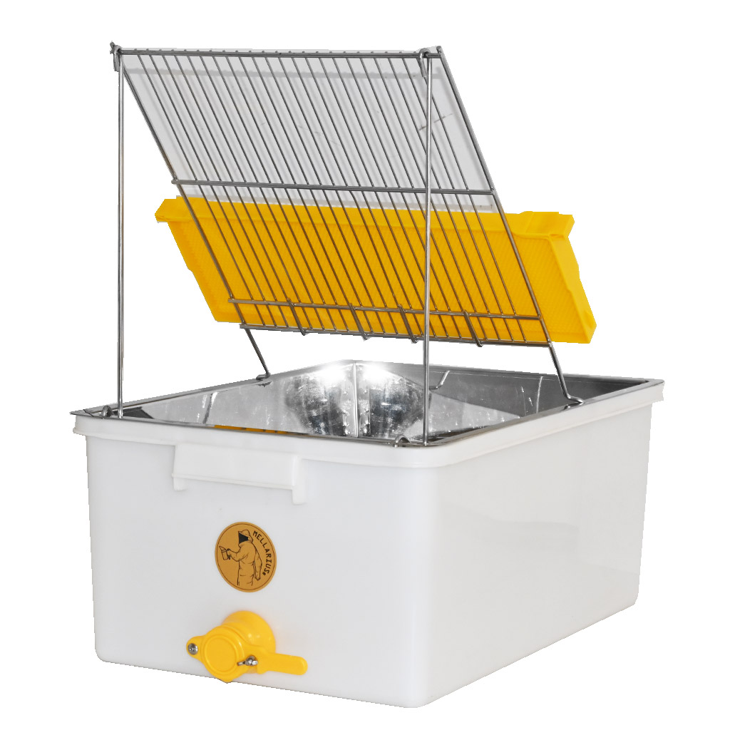 - K čemu slouží odvíčkovací talíř typ E od Mellarius?Odvíčkovací talíř slouží k pohodlnému odvíčkování plástů před medobraním. Rámek s plástem postavíte na oporu uvnitř talíře a odvíčkovací vidličkou nebo nožem odstraňujete víčka z buněk. Veškerý vosk i med zachytí plastová vanička pod nerezovým sítem.