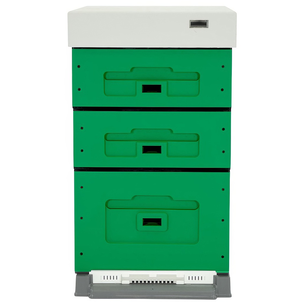 Pokud s včelařením teprve začínáte a hledáte úl, ve kterém budete mít všechno pohromadě, tahle sada je přesně pro vás. Jedná se o kompletní včelí domek v zelené barvě, vyrobený z lehkého a pevného materiálu podobného polystyrenu. Díky tomu je úl lehký na přenášení a zároveň skvěle drží včelkám teplo – v zimě jim není zima a na jaře se rychleji rozmnoží.