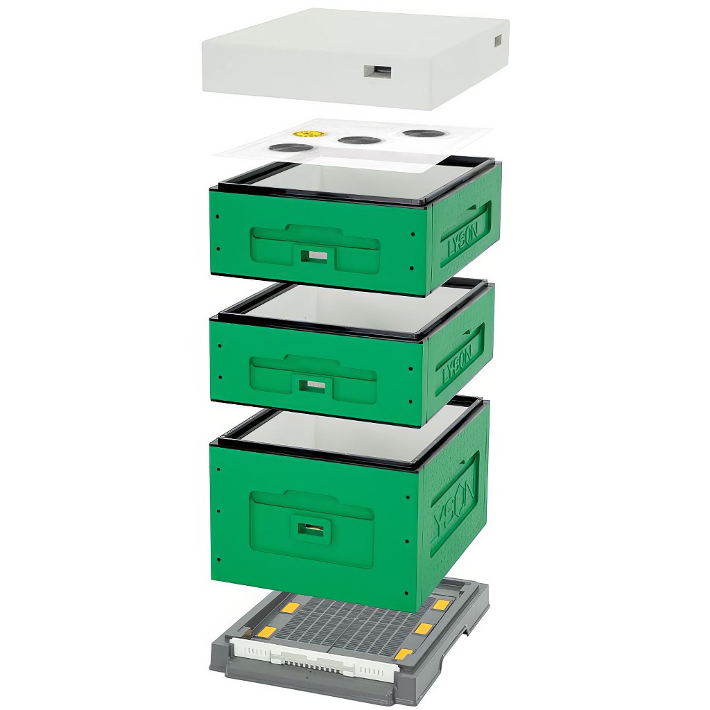 Úl v systému Dadant Blatt s jedním plodištním nástavkem (300 mm) a dvěma medníkovými nástavky (145 mm). Polystyrenová konstrukce s nízkou tepelnou vodivostí zajišťuje stabilní mikroklima plodového hnízda. Hygienické dno OPTIMA umožňuje monitoring přirozeného spadu Varroa destructor prostřednictvím průhledného tácu s integrovaným teploměrem. Ventilační otvory se zátkami se sítkem zabraňují vstupu škůdců a zároveň umožňují regulaci proudění vzduchu. Plně kompatibilní se systémem Lyson – nástavky, dna i střechy lze vzájemně kombinovat.