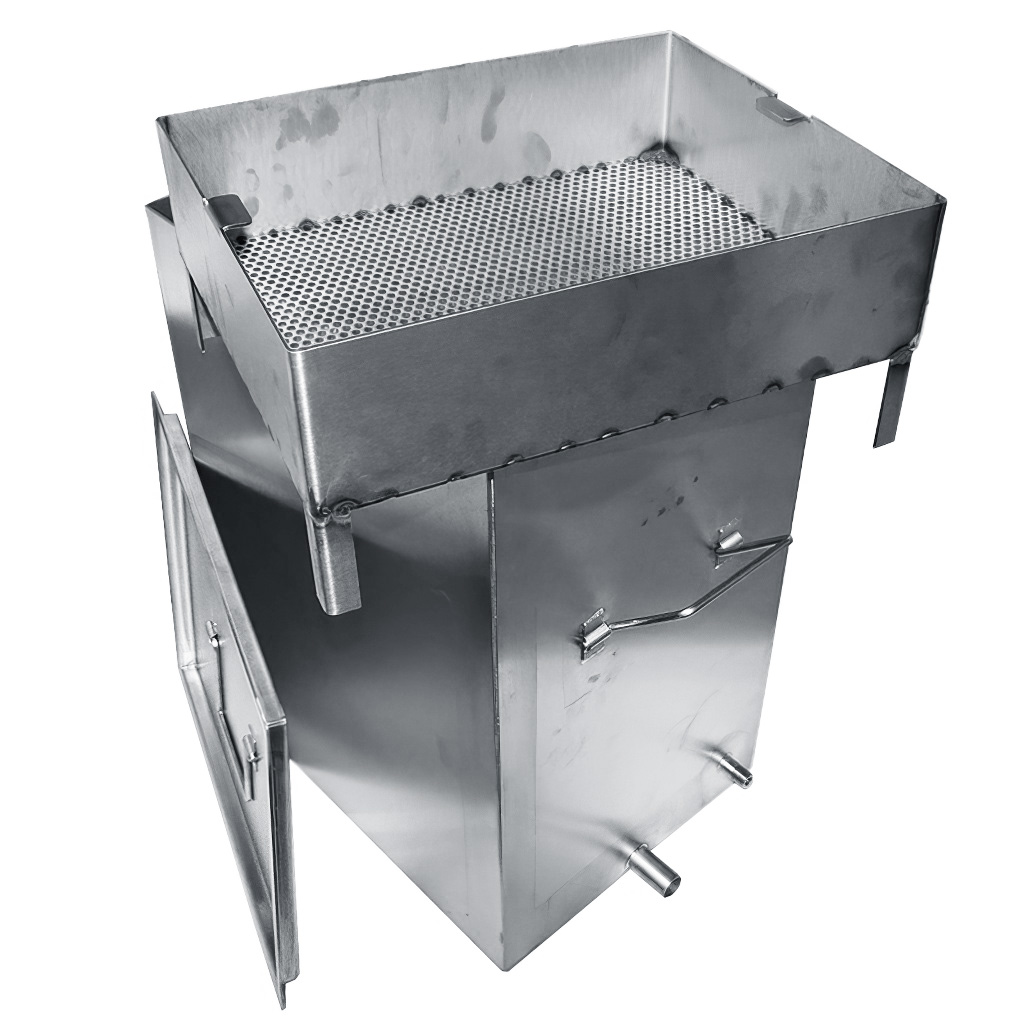- Jaké jsou rozměry a materiálové vlastnosti vařáku?Vařák má rozměry: výška 57 cm, šířka 34 cm a délka 40 cm. Je vyroben z nerezového plechu o tloušťce 2 mm. Síto má průměr otvorů 5 mm. Celé zařízení je ručně svařováno a vyráběno v Čechách.