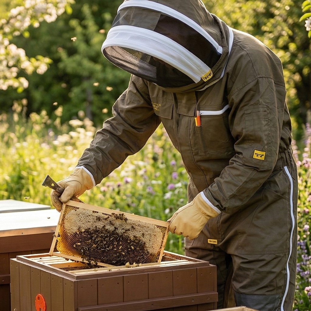 Když začínáte se včelami, jedna z prvních věcí, kterou budete potřebovat, je ochranný oblek. Tato kombinéza je vlastně jednodílný overal, který zakrývá celé vaše tělo od hlavy až po kotníky. Součástí je i kukla, tedy ochrana hlavy se síťkou před obličejem, přes kterou dobře vidíte, ale žádná včela se k vám nedostane.