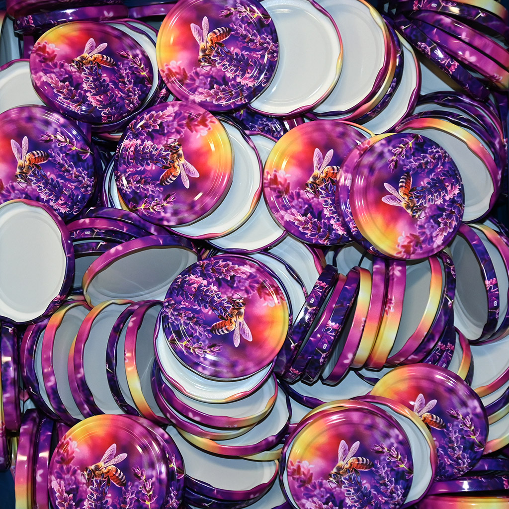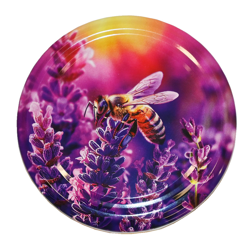 Šroubovací víčko vzor Včela a levandule - HO17 na sklenice Včela 730 ml, Facette 720 ml, Fass 720 ml, Facette 580 ml a Facette 420 ml. Graficky velmi pěkně zpracované víčko pro standardní sklenice, které se používají pro stočený med. S tímto víčkem svému medu určitě ostudu neuděláte. Celé balení obsahuje 700 kusů.