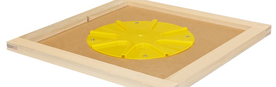 Základem je pevný dřevěný rám, který je v rozích spojen čepováním a slepen voděodolným lepidlem pro vyšší stabilitu i odolnost vůči vlhkosti. Výplň tvoří přesně usazená HDF deska (dřevovláknitá deska s vysokou hustotou) vložená do drážky v obvodovém rámu. Ve středu desky je kruhový otvor o průměru 78 mm, který slouží pro osazení plastového výkluzu a plynulý průchod včel.
