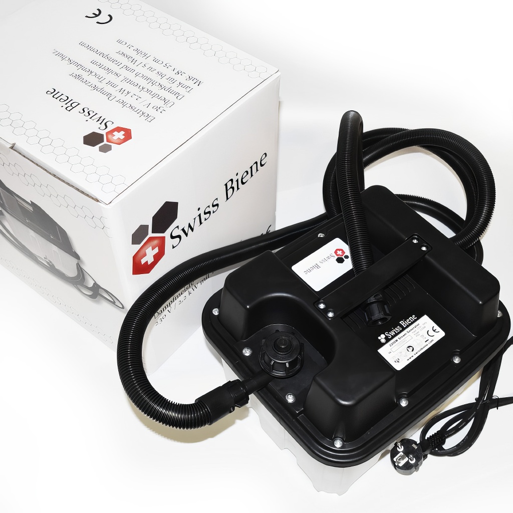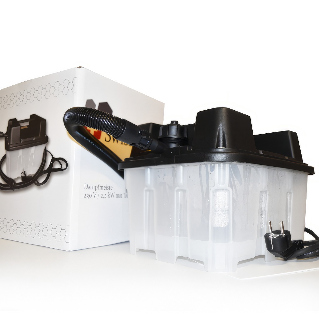 Pokud hledáte spolehlivý způsob, jak vytavit vosk ze souší bez zdlouhavého vyřezávání, parní vyvíječ Swiss Biene je přesně to pravé. Stačí naplnit vodou, připojit hadici k tavicí nádobě a zapnout. Za necelých 10 minut máte páru a během hodiny zvládnete vytavit velké množství rámků. Příkon 2,2 kW zajišťuje dostatečný výkon i pro náročnější provoz. Praktická je vestavěná ochrana proti přehřátí, která přístroj automaticky vypne při nedostatku vody, takže nehrozí jeho poškození. Vyvíječ je kompaktní, lehký a univerzálně použitelný i mimo včelaření, například ke sterilizaci horkou párou.