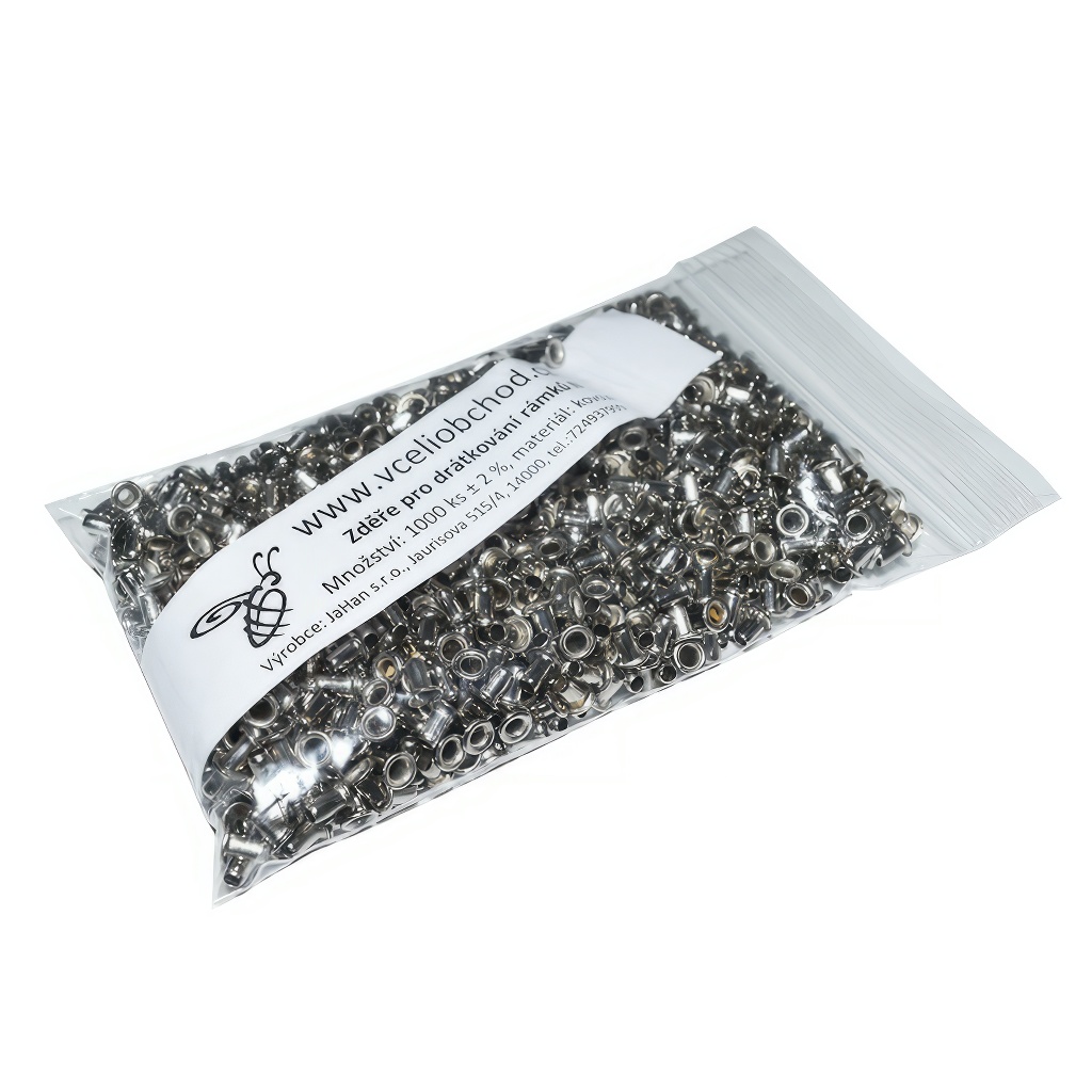 Když si ve včelařství stavíte rámky, potřebujete do nich natáhnout drátek, na kterém pak drží voskový plát (mezistěna). Drátek se protahuje skrz dírky ve dřevěných bočních lištách rámku. A právě tady přicházejí na řadu zděře. Jsou to drobné kovové kroužky, které se vloží do těchto dírek dříve, než začnete drátek protahovat. Bez nich by drátek časem zařízl do dřeva, uvolnil by se a celý rámek by přestal pořádně držet. Se zděřemi drátek drží pevně a dlouho, protože kroužek chrání dřevo před poškozením. Představte si to podobně jako průchodku na kabel – drátek jí prochází a nemůže poničit okolní materiál. Balení obsahuje 500 kusů, takže vám vydrží na hodně rámků a nemusíte se bát, že vám brzy dojdou.