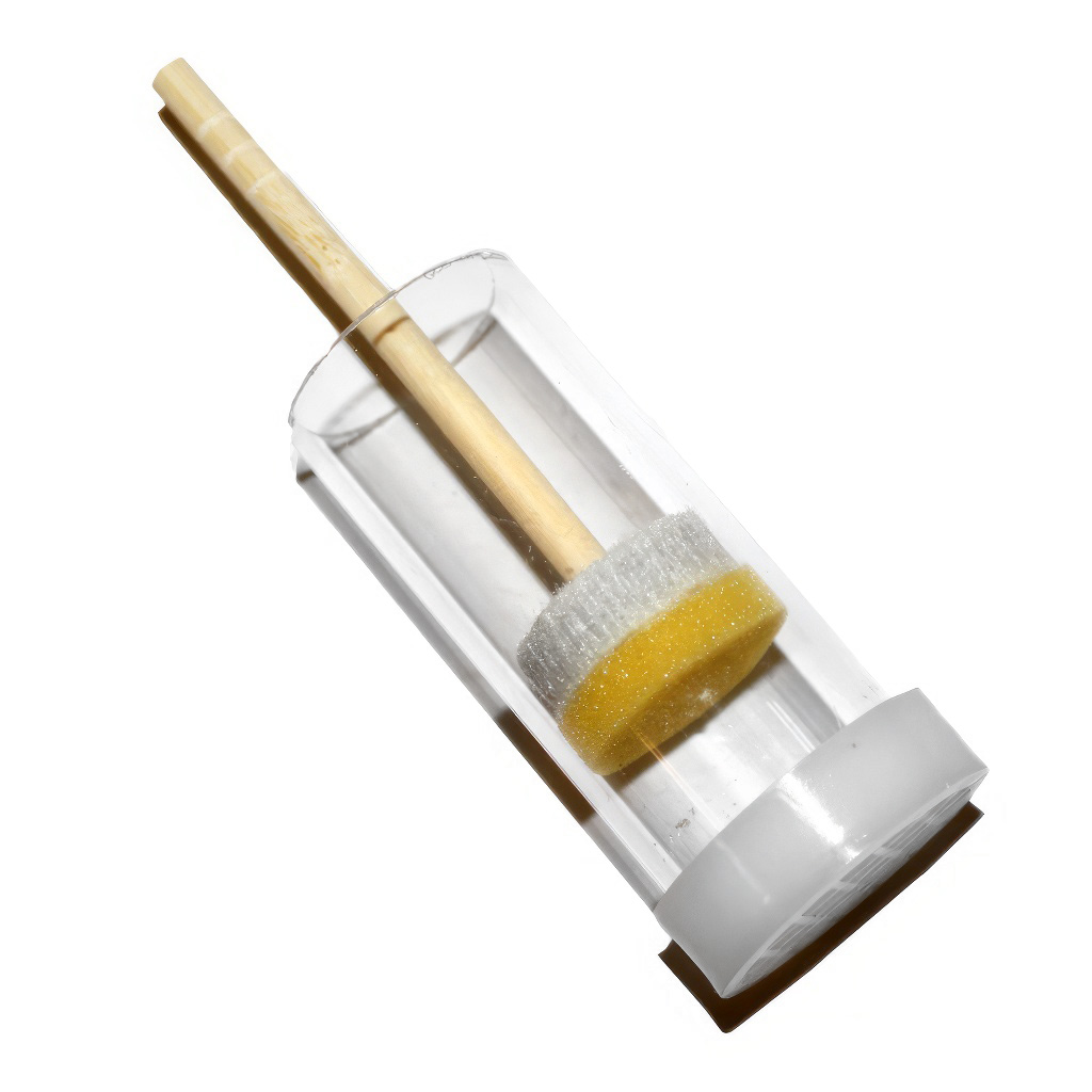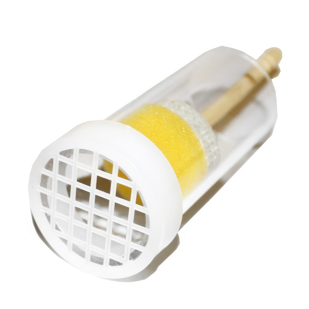 - Proč je válec písku průhledný?Průhledný válec z čirého plexiskla umožňuje neustálou vizuální kontrolu nad polohou matky během celé manipulace. Včelař tak přesně vidí, jak je matka orientovaná, a může ji správně přitlačit hrudí k mřížce pro bezpečné značení.